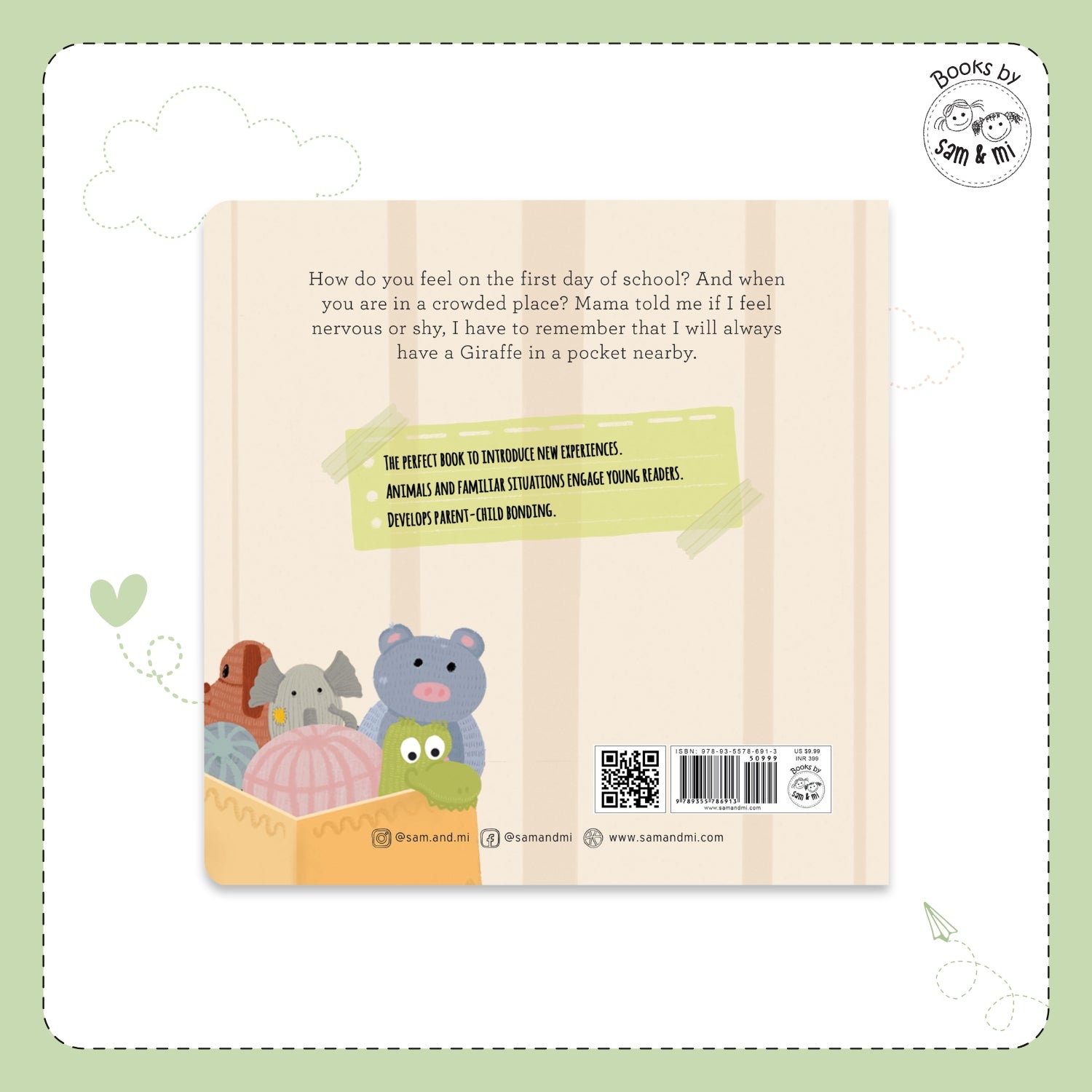How does your child feel on the first day of school? What about when they are in a crowded place? How about when you have to go to work? What if they had something to assure them they are safe? In this book, Mama introduces the child to the imaginary Giraffe in her pocket who will always be with her.